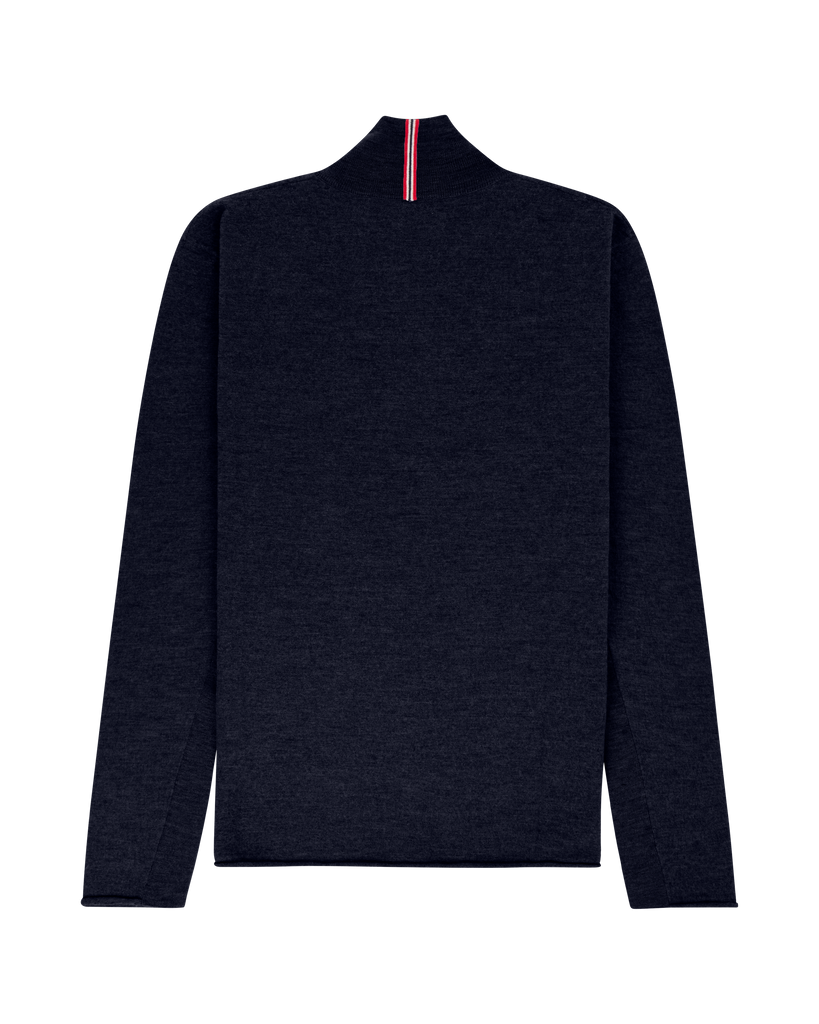 This half-zip sweater combines 100% boiled merino wool with strategically placed stretch knit panels to provide superior thermal protection and wind-blocking capability. Versatile enough to wear independently during mild winter weather or layer under a shell jacket when conditions demand additional insulation.