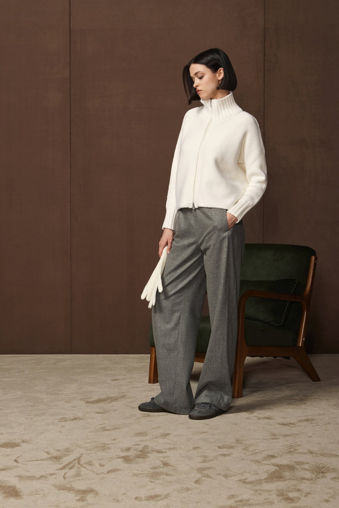This Italian-made sweater showcases premium 2-ply merino wool with a refined horizontal stockinette construction. Designed with generous kimono sleeves for unrestricted comfort and a structured ribbed collar that frames the face elegantly, the full-zip closure allows effortless layering and temperature control.