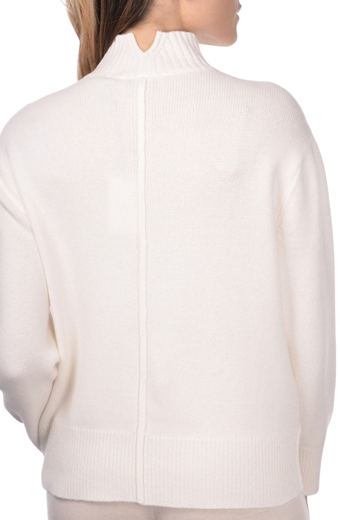 Crafted from a refined 2-ply cashmere blend, this mock neck sweater features stockinette construction with an elegant cable wave motif cascading across the shoulders and back. The dropped shoulder silhouette delivers a contemporary fit, while a distinctive back neck slit adds sophisticated visual interest.