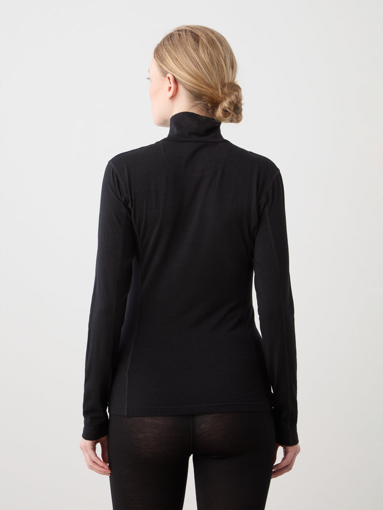 This women’s zip-up base layer features 98% superfine merino wool blended with 2% stretch fibers for comfort and flexibility. Its lightweight, breathable fabric fits like a second skin, with flatlock seams to prevent irritation. The 12.5-inch gold coil zipper offers adjustable ventilation. Packaged in a minimalist box suitable for reuse.